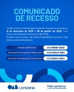 Durante esse período, não haverá expediente na sede e nas demais salas da Subseção.